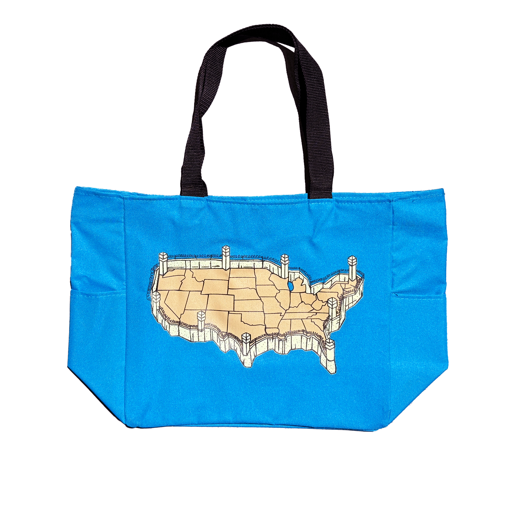 Turquoise zip tote with 2 color “American Isolationism” screen print on front